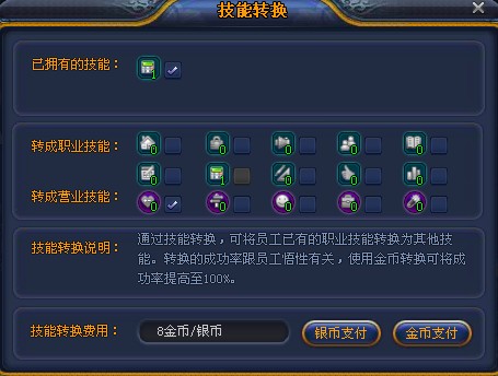 已拥有的技能可以转成职业技能或营业技能。选择职业技能和需要的技能,选择支付方式,即可进行转换。转换的技能不同,所要消耗的金币或银币也有所不同。并不是所有转换都能成功,它与员工悟性有关,而如果使用金币支付,则可百分之百转换成功。