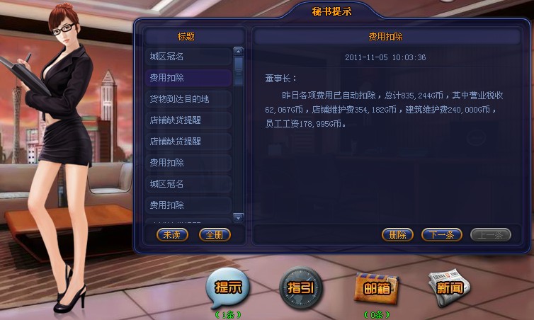 在陪游《富豪传奇》游戏中,秘书每天都有四个基本的工作:重大事件提示、指引工作、收信和发信、收集新闻等,当然,当董事长心情烦闷的时候也可以和美女秘书聊聊天解闷哦。