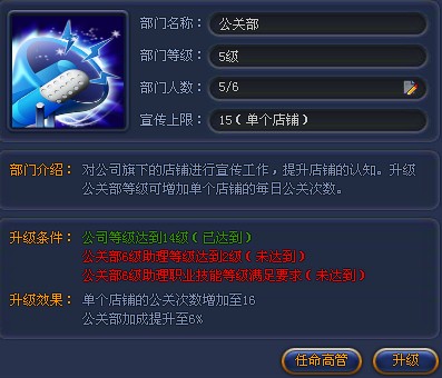 店铺宣传占用公司公关部的进程。公关部的等级影响着单个店铺每天宣传的次数上限,等级越高,次数越多。