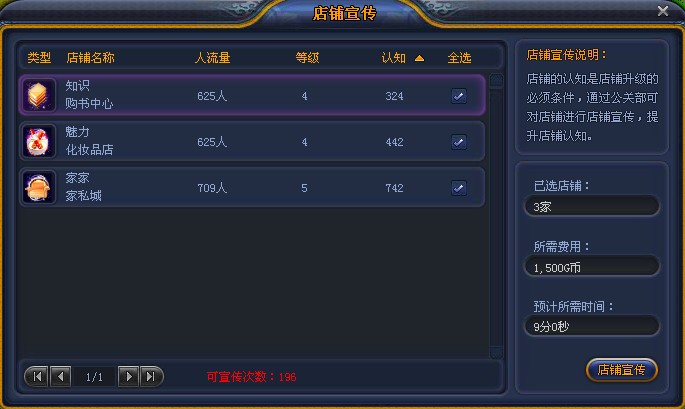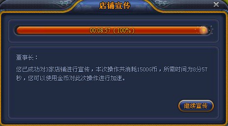 店铺宣传同样是需要花费一定的G币或金币的,精明的董事长可别舍不得花这个钱哦。店铺认知提升了,店铺升级升级了,到时候就可以提高店铺的辐射范围,从而提高店铺的辐射人流量,有客户了,还愁没生意吗?