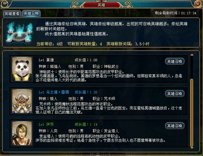 玩家可以在英雄祭坛里招募到英雄,每隔一段时间英雄祭坛会随机刷出一般分英雄,玩家只需要点击招募就可以获得自己喜欢的英雄。陪游圣树传说中英雄不仅有职业上的区别,在品质上也有优劣之分,一共分为4等从低到高依次为:白色英雄、绿色英雄、蓝色英雄、紫色英雄。英雄好坏主要体现在成长值上,品质越高的英雄成长值当然也是越高,每次升级所带来的属性提升也是越大,所以说,玩家在召唤英雄时尽量选择高成长的英雄。