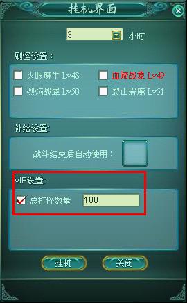 五、挂机打怪,不想多浪费精力,需要定量的控制打怪个数,单纯的挂机功能已经不能满足你的要求。VIP精确设置挂机怪物数目,想打几只就打几只,不会浪费你多一点精力和时间。